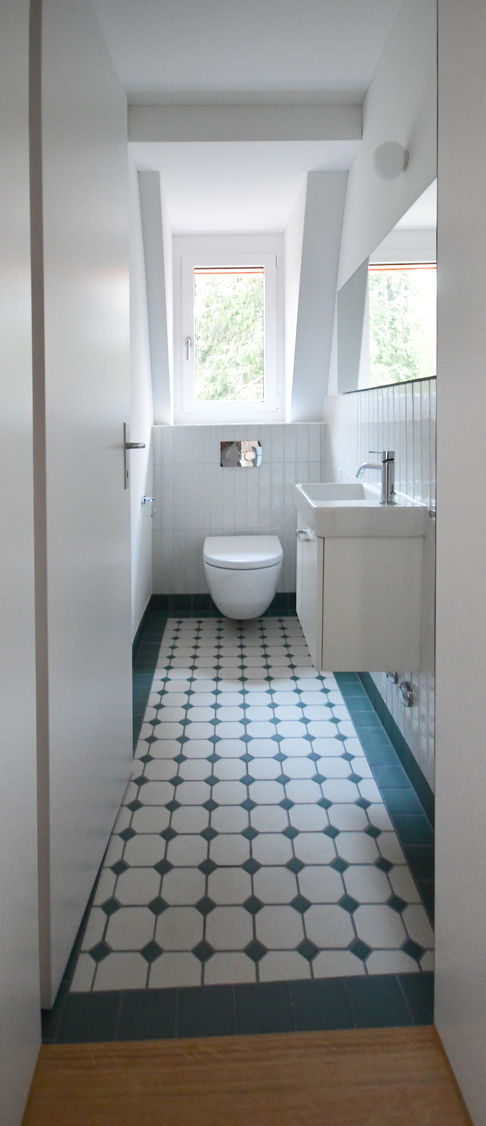 Die Materialisierung der Wohnungen ist stark auf den Stil im 1900 bezogen. Fischgratparektt in Eiche stellen eine direkte Referenz zum damaligen Ausbau dar. Weiss-grün sind die kleinteiligen Platten in Bad und Küche, dies in Anlehnung an die Farbe in im blumigen Glasfenster des Balkons. Die verzierten Wohnungstüren sowie das schmucke Holzgeländer im Treppenhaus wurden mit einer feinen Farbgebung an den Wänden ergänzt.